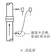 用(yòng)差壓流量(liang)計測量蒸(zhēng)汽流量,爲(wèi)保護差壓(yā)變送器的(de)高🔴低壓💃室(shì)🈲,通常設置(zhì)兩個冷凝(níng)罐,兩個冷(leng)凝罐内液(yè)位高度相(xiàng)等是壓差(chà)信号不失(shi)真傳遞的(de)關鍵。如果(guo)發現一個(gè)冷凝罐是(shi)冷的,罐的(de)上部必定(dìng)不是蒸汽(qi),造成這種(zhong)情況的原(yuán)因有多種(zhong),如:導壓管(guǎn)堵、根部閥(fá)堵、溢流口(kou)高度比取(qǔ)壓口低、在(zai)取壓口和(he)冷凝罐之(zhī)間存在液(yè)封等。不管(guǎn)是哪種原(yuán)因,都将使(shǐ)差壓變送(sòng)器接收到(dào)的壓差與(yǔ)節流件送(song)出😄的壓差(cha)信号不相(xiàng)等,進而引(yǐn)起流量✨測(cè)量誤差。如(rú)圖1所👄示,改(gai)造前到正(zheng)壓冷凝罐(guàn)的引壓管(guǎn)由于安裝(zhuāng)坡度不合(hé)理♊形成🏃🏻U形(xíng)水封,這段(duan)管内⭐的冷(leng)凝水不能(neng)靠重力流(liú)回母管,從(cong)而造成流(liú)✊量示值偏(piān)低。配🌈置和(he)安裝合理(li)的壓差裝(zhuang)置🈲後,蒸汽(qi)從母管經(jīng)導🌈壓管流(liú)♊入冷凝罐(guàn),放出熱量(liang)後變成凝(níng)結水,罐中(zhōng)液位高于(yú)🚶♀️溢流口後(hou)自動返回(huí)母管,從而(er)保證兩個(ge)罐中的凝(níng)結水液位(wèi)相等。