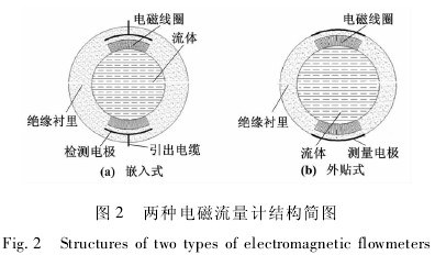 流量計是(shì)利用物理(lǐ)原理實現(xian)對一段時(shi)間内流體(ti)流量測🏃🏻量(liang)的儀器。電(dian)磁流量計(ji)具有寬量(liàng)程、耐腐蝕(shí)、結構簡單(dān)等優點,是(shi)當前常用(yòng)的流量☂️計(ji)品種之一(yī)。電磁流量(liang)計的理論(lùn)産生于20世(shi)紀20年代。當(dang)代電磁流(liu)量計大多(duo)以計算機(ji)技術爲基(ji)礎,其功📐能(neng)随着計算(suan)機的信息(xi)處理能🐇力(lì)、存儲能力(li)🔅、運算能力(lì)和計算機(ji)⛷️的控制功(gōng)能的增強(qiang)而增強。電(diàn)磁流量計(jì)革新的四(sì)個方向值(zhi)得關注:電(dian)磁流量計(ji)㊙️的結構、電(dian)磁流量計(ji)的勵磁方(fang)式、電磁流(liú)量計的信(xin)🆚号處理技(ji)🧑🏽🤝🧑🏻術以及電(dian)磁流量計(ji)的智能化(hua)等。本文以(yǐ)此爲線索(suo),總結電磁(ci)流量計的(de)發展曆程(cheng)并分析其(qi)發展趨勢(shi)。 1電磁流量(liàng)計結構 電(dian)磁流量計(jì)是利用電(dian)極與流體(ti)構成一個(ge)回路來測(ce)量💋回路中(zhong)産生的電(diàn)參數。傳統(tǒng)電磁流量(liàng)計測量🌂原(yuán)理如圖♉1所(suo)示。電磁線(xiàn)圈在直徑(jing)爲d、橫截面(miàn)積爲A的管(guan)道中産生(sheng)一個磁場(chǎng)強度爲B的(de)磁場。當有(yǒu)流體經過(guò)時會切割(gē)磁感線而(ér)産生感應(yīng)電動勢U,測(cè)量電極接(jiē)收電動勢(shì)信号。由公(gong)式可計算(suan)其流量。式(shi)中:Q爲流量(liang);k爲修正系(xi)數。 由于傳(chuán)統的電磁(ci)流量計無(wú)法測量低(di)電導率的(de)流🍉體,且對(duì)摩擦、粘附(fu)效應敏感(gan),隻能測量(liàng)流體滿管(guan)情況等,因(yīn)此需要📞改(gǎi)變🈲其結構(gou),使其能夠(gou)适應更複(fú)雜的環境(jing)。改變電♍磁(ci)流量計結(jié)構的主要(yao)方法是改(gai)變電極的(de)數量和位(wèi)置,從而形(xing)成電容電(diàn)磁流量計(jì)、非滿管電(diàn)磁流量計(ji)等。 1.1電容電(dian)磁流量計(ji) 電容式電(dian)磁流量計(ji)從根本上(shang)解決了電(diàn)極表面附(fù)🈲着、腐蝕、摩(mó)擦等問題(ti),其電極與(yǔ)被測流體(tǐ)間有絕緣(yuan)襯裏隔離(lí),或者直接(jiē)采用絕緣(yuan)測量管。電(diàn)極置于測(cè)量管外面(miàn)或鑲💃嵌于(yú)測量管内(nei)部。嵌入式(shì)電磁流量(liàng)計和外貼(tiē)式電磁流(liu)量計的結(jié)構如圖2所(suo)示。 電極與(yu)被測流體(ti)通過絕緣(yuan)管形成檢(jiǎn)測電容,通(tōng)過此電容(rong)來耦合流(liu)量信号。其(qí)主要的結(jié)構形式按(àn)照電極的(de)安裝位🙇♀️置(zhi)可以分🙇🏻爲(wèi)兩種:電極(jí)嵌入測量(liang)管的絕緣(yuan)🈲襯裏内部(bù)(嵌入式)、電(dian)極貼在測(cè)🚩量管外部(bù)(外貼式)。嵌(qian)入式結構(gou)與普通電(dian)磁流量計(ji)結構相似(si),而外貼式(shì)大多是通(tōng)過陶瓷表(biao)面金屬化(huà)技術将電(diàn)極貼在測(cè)量管外。 1.2非(fei)滿管電磁(ci)流量計 普(pǔ)通的電磁(ci)流量計隻(zhī)能測量滿(man)管流的流(liú)量,而很多(duo)情況下由(yóu)⚽于流量流(liu)速很快,有(you)時充不滿(mǎn)管道,普通(tong)的電磁☔流(liu)量計不能(néng)适用,因此(ci)希望電磁(ci)流量計能(neng)夠進行非(fēi)滿🥵管流量(liàng)的測量。目(mù)前市面上(shang)常見的非(fēi)滿管電磁(ci)流量計有(you)下面幾👅種(zhǒng)。 ①多電極式(shì)非滿管電(dian)磁流量計(ji)。其底部是(shì)一對信号(hào)注入電極(ji),中👣間有多(duo)對測量電(dian)極,頂端有(yǒu)一個滿管(guǎn)電極🐉。在滿(mǎn)🌈管情🧑🏽🤝🧑🏻況下(xia),該流量計(jì)與普通的(de)電磁流量(liang)計的功能(neng)相同,滿管(guan)情況下流(liu)體的橫截(jié)面積是固(gù)定的,此時(shí)計算流量(liang)值隻需要(yao)測量流體(ti)的流速即(ji)🔴可。當流體(tǐ)非滿管時(shí),滿管🔴電極(ji)檢測到🏃♀️管(guǎn)道非滿狀(zhuang)态,利用算(suan)法修正測(ce)量值,此時(shí)流量計的(de)測量方式(shi)改成測量(liàng)流體流速(su)和液面高(gao)度。信号注(zhu)入電極與(yǔ)在不同位(wei)置的三對(duì)測量電極(jí)共同工作(zuò),用于測量(liàng)⭐液位面的(de)高度和流(liu)體的速度(du)。多電極式(shi)非滿🌈管電(dian)㊙️磁流量計(ji)結構簡圖(tú)如圖3所示(shi)。 ②電容式非(fēi)滿管電磁(ci)流量計。電(dian)容式非滿(mǎn)管電磁流(liu)量計結構(gou)💜簡圖如圖(tú)4所示。 電容(róng)式非滿管(guǎn)電磁流量(liàng)計就是利(li)用液位的(de)變化使得(dé)電容的極(ji)距發生變(biàn)化,通過測(ce)量發送電(dian)極和檢測(ce)電極之間(jiān)的電容耦(ou)合值即可(kě)測量流量(liàng)值。 ③利用阻(zǔ)抗或信号(hao)衰減的非(fei)滿管電磁(ci)流量計。這(zhe)種結‼️構的(de)🐅非滿管電(diàn)磁流量計(jì)是當前的(de)方向之一(yi)。其結構是(shi)流👉量管底(dǐ)部貼一對(dui)信号發射(she)電極,在流(liu)量管中間(jian)貼信号接(jiē)收電極。由(yóu)于⭕信号在(zài)流體中傳(chuán)播🈲會産生(shēng)衰減,且傳(chuan)播時間越(yue)長,衰減越(yuè)多,因此通(tong)過信号接(jie)收電極接(jiē)收到的😍信(xin)号衰減量(liang)即可得知(zhi)液😘面高度(dù);同時該⭕電(dian)極還能測(ce)量流體切(qiē)割磁感線(xiàn)産生的電(diàn)動勢,以此(cǐ)達到測量(liang)非滿管🌈流(liu)量的目的(de)。阻抗式或(huò)信号衰減(jian)非滿管電(diàn)磁流量計(ji)結