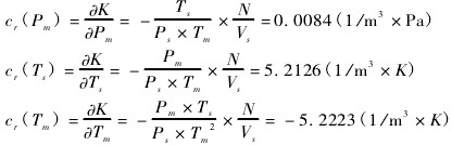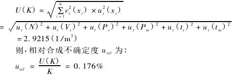 1前言 測(cè)量依據:依據(ju)檢定規程JJG1029-2007《渦(wō)街流量計》。環(huan)境條件:應符(fu)合規程要求(qiú):環境溫度爲(wei)(5~45)℃,相對濕度一(yī)般爲35%~95%,大氣壓(yā)力一般爲(86~106)kPa。 測(ce)量标準器:臨(lin)界流音速噴(pēn)嘴氣體流量(liàng)标準裝置,Ur=0.30%(k=2);壓(ya)力變送器,Urel=0.2%(k=2);溫(wēn)度變送器,Urel=0.3K(k=2)。 被(bèi)測對象:渦街(jie)流量計,精度(dù)等級1.5級。 測量(liang)介質:空氣。 測(ce)量過程:将臨(lín)界流音速噴(pēn)嘴氣體流量(liang)标準裝置流(liú)量值調整到(dao)指定數值,保(bao)持流體穩定(ding)一段時間;檢(jiǎn)定開始🧑🏾🤝🧑🏼記錄(lù)🌈标準裝置和(hé)被檢流量計(ji)的初始值❗;檢(jian)定結束後記(ji)錄标準裝置(zhì)和被檢流量(liàng)計的最終示(shì)值。 2測量的數(shù)學模型 式中(zhong),Ki—第i個測量點(diǎn)測得的儀表(biao)系數,單位爲(wèi)1/m3; Ni—第i個測量點(diǎn)測得的流量(liang)計的脈沖數(shu); Vsi—第i個測量點(dian)由裝置測得(de)的修正到被(bèi)測流量計處(chu)的實際氣體(tǐ)體積值,單位(wei)爲m3; 将Vsi換算爲(wei)被測流量計(jì)入口狀态下(xià)的數學模型(xíng)爲: 式中,Pn—測量(liang)時的當地實(shi)驗室氣體壓(ya)力,Pa; Psi,Pmi—分别爲第(dì)i點測量時标(biao)準器處和被(bei)測流量計處(chù)氣體壓力,單(dan)位爲Pa; Tsi,tmi—分别爲(wèi)第i點測量時(shí)标準器處和(hé)被測流量計(ji)處氣體溫度(dù)🏃🏻,單位爲℃; zsi,zmi—分别(bie)爲第i點測量(liàng)時标準器處(chù)和被測流量(liang)計處氣體壓(ya)縮系🙇🏻數,取zsi≈zmi,則(zé) 3各輸入量的(de)标準不确定(ding)度評定 3.1氣體(ti)流量計測量(liàng)重複性引入(rù)的不确定度(du)分量ur(Nr)評定輸(shū)入量Ni(單次測(ce)量脈沖數)的(de)不确定度來(lai)源主要是渦(wo)街流量計的(de)測量重複性(xing)引入的,選取(qǔ)工況流量爲(wèi)70m3/h,在重複條件(jian)下重複測量(liàng)6次,得到脈沖(chong)🌍數Ni如下表:(采(cai)用A類方法進(jin)行評定) 3.2臨界(jiè)流音速噴嘴(zui)氣體流量标(biāo)準裝置引入(ru)的不确定分(fen)量ur(Vs)的評定 臨(lin)界流音速噴(pen)嘴氣體流量(liàng)标準裝置向(xiàng)上級計量機(jī)構溯源,由證(zhèng)書可知标準(zhun)裝置的不确(què)定度Ur=0.30%(k=2),則由臨(lin)界流音速噴(pēn)😍嘴氣體流量(liàng)标準裝置引(yǐn)入的測量點(diǎn)爲70m3/h的實際流(liú)🧑🏾🤝🧑🏼體體積累積(ji)量(平均值)爲(wei)珔Vs=1.083m3時的絕對(dui)不确定度ur(Vs)=1.083m3*0.30%/2=0.001625m3 3.3音(yin)速噴嘴氣體(ti)流量标準裝(zhuang)置内壓力測(cè)量引入的不(bu)🥰确定🏒度ur(Ps)的評(ping)定 音速噴嘴(zuǐ)氣體流量标(biao)準裝置内壓(yā)力是由分别(bié)裝在噴嘴底(dǐ)部和頂部的(de)2台測量範圍(wei)爲(0~150)kPa的壓力變(biàn)送器進行測(ce)量後取平均(jun1)值得到的,由(yóu)溯源證書可(kě)知🔞,其測量結(jie)果的🚶♀️不确定(dìng)度分别爲:頂(ding)部Urel=0.2%,k=2;底部Urel=0.2%,k=2;由于(yú)兩台壓力變(biàn)送器分别在(zài)噴嘴的頂部(bù)和底部,互不(bú)相關,互相獨(dú)立,因此相對(duì)不确定度爲(wei):up1=up2=0.2%/2=0.1%;ur(ps)==0.1414%;則,測量點70m3/h時(shi)的标準裝置(zhi)内壓力變送(song)器的實際大(da)氣壓(平均值(zhí))爲Ps=91862Pa時的絕對(dui)不确定度爲(wei): 0.1414%*91862Pa=129.9125Pa; 3.4被檢流量計(ji)處壓力測量(liàng)引入的不确(què)定度ur(Pm)的評定(dìng) 用于被檢流(liu)量計處壓力(lì)變送器測量(liang)範圍爲(0~150)kPa,由溯(sù)源證書可知(zhī)🌈,Urel=0.2%,k=2,因此Pm的相對(dui)标準不确定(dìng)度爲:ur(Pm)=0.2%/2=0.1%;則測量(liang)點65m3/h時的流量(liàng)計處的壓力(lì)♍變送器的實(shi)際大氣壓(平(ping)均值)爲時的(de)絕對不确定(ding)度爲Pm=92227.3Pa時的絕(jué)對不确定度(dù)爲:0.1%*92227.3Pa=92.2273Pa; 3.5音速噴嘴(zuǐ)氣體流量标(biāo)準裝置内溫(wen)度測量引入(rù)的🛀🏻不确定度(du)ur(ts)的評定 音速(su)噴嘴氣體流(liu)量标準裝置(zhi)内的溫度變(biàn)送器測🌈量範(fàn)圍爲(0~50)℃,由溯源(yuan)證書可知,其(qi)測量結果的(de)不确定度爲(wèi)⛱️U=0.3K,k=2,則由标準裝(zhuang)置溫度引入(rù)的絕對不确(què)定度爲: 3.6被檢(jiǎn)流量計處溫(wen)度測量引入(ru)的不确定度(du)ur(tm)的評定 被測(ce)流量計處的(de)溫度變送器(qì)測量範圍爲(wèi)(0~50)℃,由溯源證書(shū)可知,其測量(liang)結果的不确(que)定度爲U=0.3K,k=2,則由(you)被測流量計(ji)處溫⭐度引入(ru)的絕對不确(què)定度爲: 4合成(chéng)标準不确定(dìng)度評定 4.1靈敏(min)系數 取:K=1422.91/m3,N=1662.167,Vs=1.083m3,Pn=92600Pa,Ps=91862Pa,Pm=92227.3Pa,ts=22.417℃,tm=21.869℃ 令:Ps=Pn+Ps;Pm=Pn+Pm;Tm=273.15k+tm;Ts=273.15k+ts; Ps=92600+91862=184462Pa,Pm=92600+92227.3=184827.3Pa; Tm=273.15+21.869=295.019k,Ts=273.15+22.417=295.567k; 則(zé)各靈敏系數(shù)爲: 4.2标準不确(que)定度彙總表(biao) 由于以上輸(shu)入量不确定(dìng)度分量批次(cì)獨立,互不相(xiàng)關✏️,故合🛀🏻成🌈标(biao)準不确定度(du)爲: 5擴展不确(que)定度的評定(dìng) 取包含因子(zi)k=2,Urel≈0.36% 6測量不确定(dìng)度的報告與(yǔ)表示 渦街流(liu)量計在流量(liang)點70m3/h時儀表系(xì)數K=1662.167(1/m3),相對不确(què)定度爲:Urel≈0.36%,k=2。 7結論(lùn) 從上述不确(que)定度分析中(zhōng)可看出,擴展(zhan)不确定度與(yǔ)🐅渦街流量計(jì)口徑沒有關(guan)系,重複性會(huì)随着流量點(dian)♍的變📧化而改(gǎi)變,但在被測(cè)