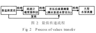 泵站曾(ceng)按ISO标準(zhǔn)規定位(wei)置布置(zhì)26台流速(sù)計,測量(liang)大型水(shui)🏃♀️泵3.5m×1.5m矩形(xíng)出水流(liú)道平均(jun)流速,以(yǐ)校準用(yong)差壓法(fa)測🏃♀️量泵(beng)進水道(dao)差壓的(de)流出系(xì)數,測量(liàng)流速在(zài)1.2~1.3m/s之間。期(qi)🛀間還用(yòng)食鹽濃(nong)度法校(xiào)準流速(su)計面積(jī)㊙️法,在實(shí)驗過程(cheng)中再用(yòng)食鹽濃(nong)度法複(fu)核流速(su)計面積(ji)法的數(shù)據[3]。量值(zhi)傳遞流(liú)🥵程如圖(tú)2所示。