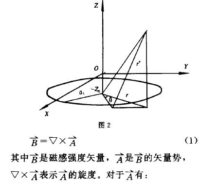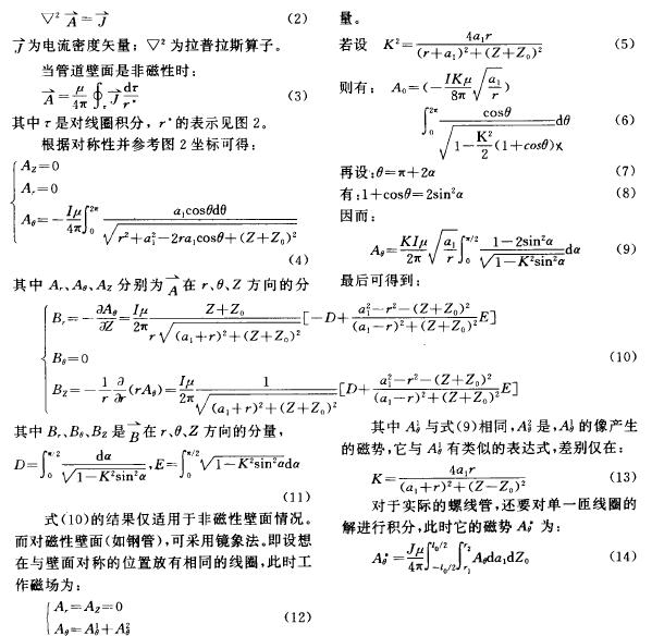 圖1中,插(cha)入式電磁流量計(ji)探頭的端部裝有(yǒu)一對電極,内部裝(zhuāng)有一勵磁線圈,在(zài)它的周圍産生工(gōng)作磁場。爲研究磁(cí)場的詳細分布狀(zhuang)況,先考慮單匝線(xian)圖。設其半徑爲al,裝(zhuāng)在離端部Z。處,流過(guo)的電流爲I,流體中(zhong)的磁介質😘常數爲(wèi)産。采用矢量勢的(de)表示法有:
