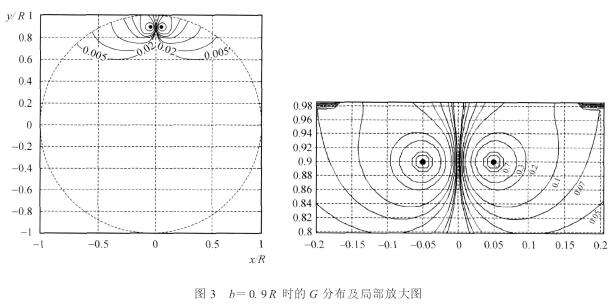 取b= 0.9R(R爲管道半(ban)徑),θ= 0.0555rad,繪制G分布(bù)并放大電極(ji)附近區域如(ru)圖🌈3所示。