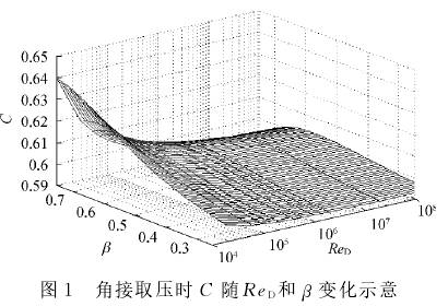 根(gēn)據Reader-Harris/Gallagher公式,可畫出不(bu)同管道直徑和不(bú)同取壓方式下,C與(yu)ReD,β之間的關系曲面(mian)。角接取壓,D=150mm時,C與ReD,β的(de)關系如圖1所示💋。