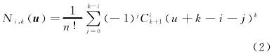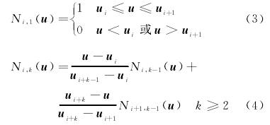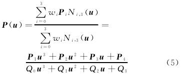 式中:wi———權(quan)因子,分别與控制(zhì)頂點Pi相聯系,(i=0,1,…,n);Ni,k(u)———節點(diǎn)矢量,u=[u0,u1,…,un+k+1]按遞推公式(shi)确定的k次規範B樣(yang)條基函數;P1,P2,P3,P4———分子系(xi)數,爲矢量;Q0,Q1,Q2,Q3———分母系(xì)數。B樣條基函數的(de)遞推公式見式(3)~式(shì)(4)。