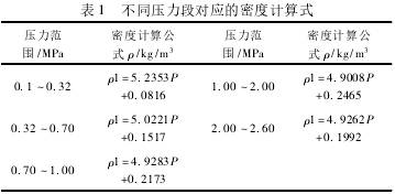 解決(jué)這個矛盾(dùn)的方法是(shi)分段拟合(he),即在不同(tóng)的壓力段(duàn)采用不同(tóng)的系數和(hé)常數。表1所(suǒ)示爲不同(tong)壓力段對(dui)應的不同(tong)密度計算(suàn)💰式[4]。