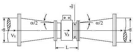 爲(wei)了在安裝(zhuang)異徑管後(hòu)不過多影(ying)響流速的(de)分布,不影(ying)響電磁流(liu)量計的精(jīng)度,要求異(yì)徑管的中(zhong)心錐角 α不(bú)大于15°,越小(xiǎo)越好。這樣(yàng)可把異徑(jing)管視爲直(zhi)管段的一(yi)部分⚽。