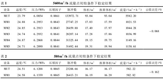 摘要(yào):以标準表(biǎo)法流量标(biāo)準裝置爲(wei)例,首先介(jie)紹了天然(rán)氣流量計(jì) 檢定的原(yuan)理,然後對(dui)檢定工況(kuang)參數不穩(wen)定或工況(kuàng)參數測量(liàng)👉不準确對(duì)檢定結果(guo)的影響進(jin)行定性和(he)定量計算(suan)☔分析,最後(hou)對保證流(liú)量計檢定(dìng)結果準确(què)可靠的措(cuo)施及多種(zhong)不😘同工藝(yì)的流量核(he)查方案進(jìn)行研究和(he)🈲讨論。實踐(jian)證明,流量(liang)核查技術(shu)的應用是(shì)🥰保證流量(liang)計檢定結(jié)果準确可(kě)靠的有效(xiao)措施。 0引言(yan) 天然氣流(liú)量計實流(liú)檢定是一(yi)個多參數(shu)組合測量(liang)🏃🏻過程💜,影響(xiǎng)檢定數據(ju)準确性的(de)因素較多(duo)。檢定工況(kuang)🤞參數🏃不穩(wěn)定,參數測(ce)量結果不(bú)準确,标準(zhun)流量計的(de)性能發生(sheng)變化等都(dou)會影響檢(jian)定結果的(de)準确性和(he)可靠性。要(yao)準确開展(zhan)天然氣流(liu)❗量計量,必(bì)✌️須對這些(xie)㊙️影響因素(sù)進👄行充分(fèn)的研究和(hé)分析,并采(cǎi)取必要的(de)技術措施(shī)。 1流量計檢(jiǎn)定的原理(lǐ) 采用标準(zhun)表法流量(liang)标準裝置(zhì)檢定流量(liang)計依據的(de)是流體流(liú)動的連續(xu)性原理,即(jí)質量守恒(héng)原理[1],如圖(tú)1所示🌈。 标準(zhun)流量計MM和(he)被檢流量(liàng)計MUT用管道(dào)連接,在測(cè)試時🏃🏻間内(nei),流入标準(zhǔn)流量計MM的(de)質量流量(liàng)爲m1,流入被(bèi)檢流量計(ji)MUT的質量流(liú)量爲🈲m2,标準(zhǔn)流量計和(he)被檢流量(liàng)計間😘管容(róng)内質量變(biàn)化量爲Δm,則(zé): m1=m2+Δm(1) 當流動達(da)到穩定狀(zhuang)态時,Δm=0,所以(yǐ) m1=m2(2) 亦即天然(rán)氣流量計(ji)的檢定是(shì)在穩定條(tiáo)件下使天(tian)✊然氣連🤞續(xu)流過标準(zhǔn)流量計和(hé)被檢流量(liàng)計,記錄在(zài)相同時間(jiān)間隔🚩内标(biao)🙇🏻準流量計(ji)和被檢流(liú)量計的測(cè)量值,通🐉過(guo)計算被檢(jiǎn)流量計的(de)示值誤☔差(cha)和重複性(xing)等計量性(xing)能參數,來(lái)🧑🏽🤝🧑🏻判斷流量(liàng)計檢定是(shi)否合格[2]。 流(liu)量計示值(zhi)誤差可用(yong)式(3)和式(4)計(ji)算: 式中:E爲(wei)被檢流量(liang)計的相對(dui)示值誤差(chà),%;Qm爲被檢流(liu)量✏️計💃的累(lèi)積流量,m3;Qs,m爲(wèi)标準流量(liàng)計的累積(ji)流量換算(suan)到被檢流(liu)量計處工(gōng)況條件📐下(xià)的流量值(zhí),m3;Qs,s爲标準流(liú)量計的累(lei)積流量,m3;p爲(wèi)天然📞氣的(de)壓力,MPa;T爲天(tiān)然氣的溫(wen)度,K;Z爲天然(rán)氣☎️的壓縮(suo)因子。下标(biāo)s表示标準(zhǔn)流量計處(chu)的參數,下(xià)标m表示被(bei)檢流量計(jì)處的參數(shù)。 2影響檢定(dìng)結果的因(yin)素分析 2.1工(gōng)況參數穩(wěn)定性的影(ying)響 由式(1)可(ke)見,當檢定(dìng)過程中工(gōng)況參數不(bu)穩定時,m1≠m2,亦(yi)即流過标(biāo)準流量計(ji)和被檢流(liú)量計的量(liàng)值不一緻(zhì),此時用式(shì)(3)計算得🈚的(de)示♊值誤🌏差(cha)不能準确(què)地反映流(liú)量🏒計的真(zhēn)實特性。 由(yóu)于在一次(cì)檢定過程(chéng)中天然氣(qi)組分變化(huà)不大,所💜以(yǐ),此✔️處隻考(kǎo)慮壓力和(hé)溫度變化(hua)的影響。根(gen)據狀态方(fang)程,管容内(nei)天然氣的(de)質量變化(huà)量可用式(shì)(5)計算。 式中(zhong):p爲管容内(nèi)天然氣壓(ya)力,Pa;V爲管容(rong),m3;M爲天然氣(qi)摩爾質🐕量(liàng),kg·kmol-1;Z爲管容内(nei)天然氣的(de)壓縮因子(zǐ);R爲通用氣(qì)體常數,J/(mol·K);T爲(wei)管容💰内天(tian)然氣溫度(dù),K。 以一組實(shi)際檢定數(shù)據爲例,分(fen)别給出壓(ya)力和溫度(dù)變化對流(liu)🐇量計檢定(dìng)結果的影(yǐng)響。 檢定一(yi)台DN250流量計(ji),每次檢定(ding)時間爲60s;在(zai)流量爲5600m3/h下(xia),使用5台并(bìng)聯安裝的(de)标準流量(liang)計,在流量(liàng)爲580m3/h下,使用(yòng)1台♉标準流(liú)量計,初始(shi)檢🚶定結果(guǒ)如表1和表(biao)2所示。該标(biāo)準表與被(bèi)檢表之間(jian)管道的容(róng)積爲9.778m3,累積(jī)質量分别(bie)爲4451.96kg和466.18kg。 檢定(ding)參數變化(hua)引起附加(jiā)管容中質(zhì)量變化對(dui)示值誤差(chà)✍️的影響用(yòng)式(6)計算: 假(jia)設檢定過(guo)程中壓力(li)變化±5kPa,溫度(dù)變化±0.2℃,對檢(jian)定結果💋的(de)影☀️響見表(biao)3和表4。 檢定(dìng)規程JJG1030[3]和JJG1037[4]中(zhong)規定對準(zhǔn)确度等級(jí)不低于1.0級(ji)的流量計(ji),在每個流(liu)量點的每(měi)一次檢定(ding)過程中,壓(yā)力波動應(ying)不超過±0.5%,檢(jiǎn)定用氣體(tǐ)的溫度變(biàn)化應不超(chāo)過±0.5℃。按此規(guī)定計算壓(ya)☔力變化±30kPa、溫(wen)度變化±0.5℃時(shí),對檢定結(jie)果的影響(xiang)見表5和表(biao)6。 可見,工況(kuang)參數的穩(wěn)定性對檢(jiǎn)定結果有(you)較大的影(yǐng)響,尤其是(shi)小流量點(diǎn),因爲累積(ji)流量較小(xiao),所以,影響(xiang)更大🈲,而且(qie)壓力或溫(wen)💛度變化爲(wèi)檢定規程(chéng)最大允許(xu)值時将産(chan)生不可忽(hū)略的影響(xiǎng)。 爲了保證(zhèng)檢定結果(guo)準确,除了(le)保證在檢(jian)定過程中(zhōng)😄工況參❤️數(shù)處于穩定(dìng)狀态外,在(zai)設計階段(duan)還應該考(kǎo)慮盡✨可能(néng)減小标準(zhun)流量💃🏻計和