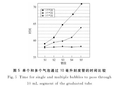 在(zài)實驗中還(hái)進行了多(duo)個氣泡和(hé)單個氣泡(pào)擴散速度(du)的比較。單(dan)🍓個和多個(ge)氣泡通過(guò)10ml刻度管的(de)時間如圖(tu)5所示。使用(yòng)2個氣泡🔴的(de)擴散問題(tí)略有減小(xiao),當使用5個(gè)氣泡時,肥(fei)皂膜移動(dong)得更均勻(yun)。這表明使(shǐ)用更多的(de)氣泡會🐪顯(xian)著提高測(ce)量的準确(que)性。