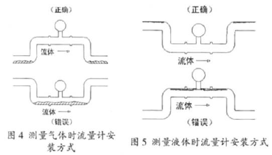 圖(tu)4是測量氣體、蒸汽(qi)時流量計的安裝(zhuāng)方式,将流量🌈計位(wèi)置擡高,避免在流(liu)量計處聚集液體(tǐ);圖5是測量液體㊙️時(shi)流量計的安裝方(fang)式,将流量計位置(zhi)降低,避☎️免在流量(liang)計處聚集氣泡。