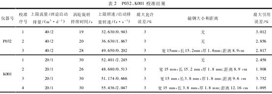 渦(wo)輪葉片(pian)能轉動(dong)的持續(xu)時間是(shì)指渦輪(lun)調試好(hǎo)後,在❤️一(yī)定作用(yong)力下,渦(wo)輪葉片(pian)從轉動(dòng)開始到(dào)停止的(de)時間。由(you)表🐉2可知(zhi),P032第1次校(xiao)準時,解(jie)卡裝置(zhi)末端沒(méi)有安裝(zhuāng)磁鋼,渦(wo)輪調試(shì)結果持(chi)續時✌️間(jian)19s,最大引(yǐn)用誤差(cha)3.012%不合格(ge),啓動排(pái)量2m3/d時,平(píng)💃🏻均轉速(sù)爲🈚0.943r/s,渦輪(lun)雖然沒(méi)有轉動(dòng),但已接(jiē)近轉動(dong)。P032第2次校(xiào)準時,解(jie)卡裝置(zhi)🐇末端沒(méi)有安✏️裝(zhuāng)磁鋼,渦(wo)輪調試(shi)結果持(chi)續時間(jiān)20s,最大引(yǐn)用誤差(cha)2.856%合格,啓(qǐ)動排量(liang)2m3/d時,渦輪(lun)轉動,平(ping)均轉速(su)爲1.867r/s。K001第1次(ci)校準時(shí),解卡裝(zhuāng)置末端(duān)沒有💞安(an)裝磁鋼(gāng),渦輪調(diào)試結果(guo)持續時(shí)間30s,最大(dà)引用誤(wu)差2.458%合格(ge),啓動排(pai)量1m3/d時,渦(wō)輪轉動(dòng),平均轉(zhuan).速爲2.245r/s。P032和(hé)K001的校準(zhǔn)結果♋表(biao)明,在啓(qǐ)動排量(liàng)時,渦輪(lun)⛷️葉片轉(zhuan)動的持(chí)續時間(jiān)超💃🏻過20s,就(jiù)可以保(bao)證啓動(dong)排量、最(zui)大引用(yòng)誤差合(hé)格。爲了(le)提高渦(wo)輪流量(liang)計校準(zhǔn)精度,硬(yìng)性規定(ding)爲了保(bǎo)證啓動(dòng)排量,渦(wō)輪葉片(piàn)轉動的(de)持續時(shi)間爲30s。