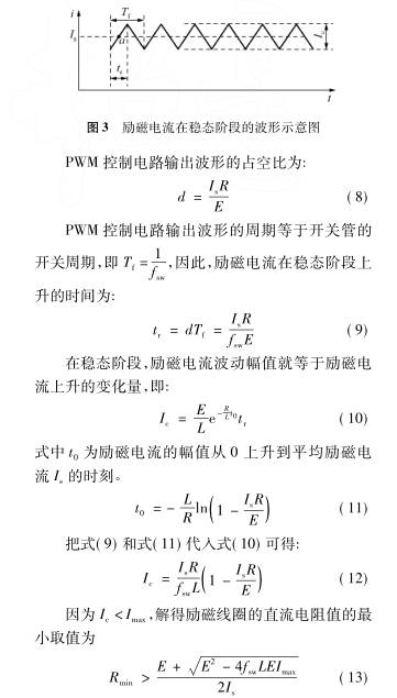 所以(yi),爲了使(shi)基于PWM控(kong)制的脈(mò)沖勵磁(cí)系統在(zai)設定的(de)開❤️關頻(pín)率下正(zhèng)常工作(zuò),且勵磁(cí)電流值(zhí)在穩态(tai)階段的(de)波動幅(fú)值小于(yu)Imax,勵磁線(xian)圈的直(zhi)流電阻(zǔ)值需要(yào)滿足式(shi)(7)和式(13)所(suǒ)決定的(de)範圍。