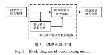 根據前(qián)饋控制的(de)自适應極(ji)化噪聲抵(di)消原理,設(shè)計了信号(hào)調理電路(lù)2,以實現極(ji)化噪聲的(de)濾除。信号(hao)調理電路(lù)2主要包括(kuo)前置差分(fen)放大電路(lu)、極化噪聲(shēng)提取與抵(di)⭕消電路、低(dī)通濾波放(fang)大㊙️電路三(sān)部分。調理(lǐ)電路如圖(tú)3所示。
