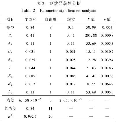 對(duì)表1試驗(yan)中各因(yīn)素進行(hang)顯著性(xìng)分析,分(fèn)析結果(guǒ)如表2所(suǒ)示,模型(xing)顯著差(cha)異水平(píng)p=0.004,說明.回(hui)歸方程(chéng)關系顯(xiǎn)著;決定(dìng)系數R2=0.9927,說(shuo)明回歸(gui)有效,試(shì)驗結果(guo)可靠。由(you)表2還可(kě)以看出(chū)8個因素(su)均對流(liú)量計線(xian)性度誤(wu)差影響(xiǎng)顯著,其(qí)中葉輪(lun)葉片數(shu)N1、葉輪頂(dǐng)端半徑(jìng)R1、葉片輪(lún)毂半徑(jìng)R.。、葉輪輪(lun)毂長度(dù)Lh這4個爲(wèi)顯著影(ying)響參數(shu),在後文(wén)中運用(yòng)響應面(mian)法進行(hang)優化;而(er)葉輪導(dao)程L、前導(dǎo)流件長(zhǎng)度H1、後導(dao)流件長(zhang)度H2、導流(liu)體葉片(pian)數N2這4個(ge)爲次顯(xiǎn)著影響(xiang)參數,在(zài)後文中(zhōng)運用正(zheng)交試驗(yan)進行優(you)化。
