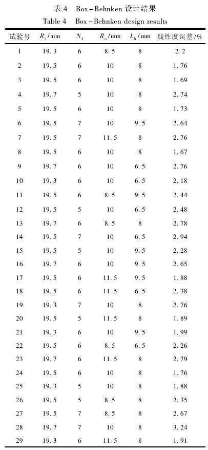 采(cǎi)用Box-Behnken中心(xin)組合設(shè)計方法(fa),以葉輪(lún)頂端半(ban)徑Rt、葉片(pian)數N1、葉片(pian)輪毂半(bàn)徑R.。、葉輪(lún)輪毂長(zhǎng)度Lh這4個(gè)顯著影(yǐng)響因素(su)爲自變(bian)量,儀表(biǎo)系數線(xiàn)性度誤(wu)差爲響(xiang)應值,其(qí)餘結構(gou)參數保(bǎo)持不變(bian),設計四(sì)因素三(san)水平29個(gè)試驗點(dian)的響應(yīng)面優化(hua)試驗。因(yin)素與水(shuǐ)平見表(biao)3,試驗設(she)計見表(biao)4。