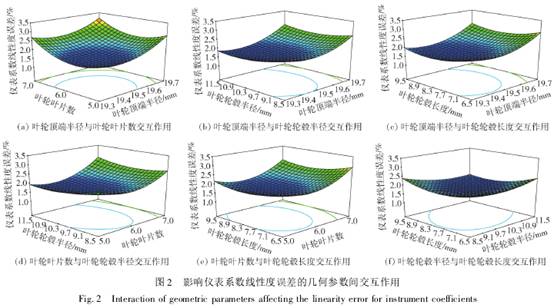 從圖(tú)2(a)~(f)可形象(xiàng)地看出(chū)影響儀(yí)表系數(shu)線性度(dù)誤差的(de)幾何參(can)數間交(jiao)互作用(yòng)。比較圖(tu)2各個分(fèn)圖可知(zhi),葉輪頂(ding)端半徑(jing)R1對儀表(biǎo)系數線(xian)性度誤(wu)差的影(ying)響最爲(wei)顯著,表(biǎo)現爲曲(qu)線最陡(dou),其餘因(yin)素影響(xiǎng)大小順(shùn)序爲葉(ye)輪葉片(pian)數N1>葉輪(lún)輪毂長(zhǎng)度Lh>葉輪(lun)輪毂半(ban)徑R。這也(yě)與表5的(de)方差分(fèn)析結果(guo)相吻合(hé)。