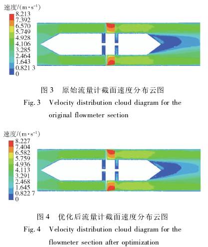 圖(tú)3和圖4分(fen)别爲原(yuan)始流量(liang)計與優(yōu)化後流(liu)量計的(de)截面速(su)度分布(bù)雲圖。對(duì)比圖3和(hé)圖4可以(yǐ)看出,優(you)化後的(de)流量計(jì)在後導(dǎo)流件.上(shàng)下部分(fèn)的流場(chǎng)速度分(fen)布較原(yuan)始流量(liang)計更加(jia)均勻,說(shuō)明優化(huà)後流量(liàng)計的葉(yè)輪結構(gou)在流場(chǎng)中的旋(xuan)轉穩定(dìng)性更好(hǎo),從而使(shi)得測量(liang)精度得(dé)到提高(gāo)。
