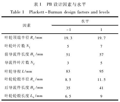 根(gēn)據.Plackett-Burman(PB)試驗(yan)設計,選(xuan)取8個試(shi)驗因素(sù)(葉輪頂(dǐng)端半徑(jing)、葉輪葉(yè)片數、葉(ye)輪輪毂(gu)半徑、葉(yè)輪輪毂(gu)長度、葉(yè)輪導程(chéng)、前導流(liu)件長度(du)、後導流(liú)件長度(du)、導流體(tǐ)葉片數(shu))和3個空(kōng)白因素(su),每個因(yīn)素設高(gāo)、低兩個(gè)水平,以(yi)儀表系(xì)數線性(xing)度誤差(chà)爲響應(yīng)值,共計(jì)12個試驗(yan),試驗設(shè)計因素(su)及水平(ping)見表1。