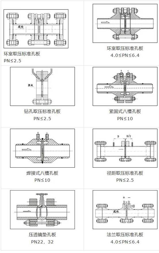 節(jie)流件:标準(zhun)孔闆、标準(zhun)噴嘴、長徑(jìng)噴嘴、1/4圓孔(kǒng)闆、雙重孔(kǒng)闆、偏心孔(kong)闆、圓缺孔(kǒng)闆、錐形入(ru)口孔闆等(děng)