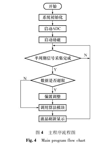 軟件(jiàn)設計采(cai)用模塊(kuài)化設計(jì)方案,主(zhǔ)要功能(neng)模塊有(you):初始化(huà)模塊💘、驅(qū)動模塊(kuai)、數據處(chu)理模塊(kuai)、人機接(jiē)口模塊(kuài)等,程序(xu)流程圖(tu)如圖4所(suǒ)示。系統(tong)上電後(hou)先進行(háng)初始化(huà),然😍後配(pèi)置兩片(pian)ADC同步采(cai)樣,開啓(qǐ)勵磁中(zhong)斷,勵磁(cí)開始工(gōng)作。半周(zhōu)期采樣(yang)結束後(hou)判斷采(cǎi)集到的(de)信号⛷️電(diàn)壓是否(fou)超限,之(zhī)後調用(yong)算法模(mo)塊,刷✊新(xin)液晶顯(xian)示。在算(suàn)法模塊(kuai)中,先是(shi)對采集(ji)到的信(xìn)号電壓(yā)進行梳(shu)狀帶通(tong)濾波處(chu)理,再将(jiang)濾波後(hòu)的電壓(ya)除以對(dui)應勵磁(cí)電流,然(rán)後對電(dian)壓電流(liu)比值進(jin)行半周(zhou)☁️期幅值(zhí)解調,對(dui)解調後(hou)的比值(zhí)取5點求(qiú)均值作(zuò)爲輸出(chu)結果參(cān)與到流(liu)速的計(ji)算🥰。