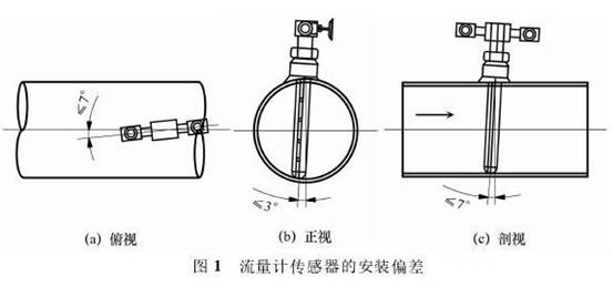 爲了保(bǎo)證流量計(ji)的測量精(jing)度,傳感器(qi)安裝時應(ying)将偏差控(kòng)制在一定(dìng)範圍(見圖(tú)1)。傳感器的(de)總壓孔必(bì)須正對流(liú)向,偏差不(bú)大于7°[現圖(tú)1(a)];傳感器應(yīng)沿管道直(zhí)徑⭐方向插(cha)入到底,安(an)裝偏差控(kong)制如圖1(b)和(hé)(c)_國.所示。.