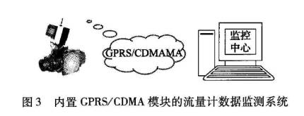 當圖2中流(liu)量計内嵌GPRS/CDMA模塊(kuai)時,流量計即可(ke)直接通過♻️GPRS/CDMA連接(jiē)📐到數據監控中(zhong)心,省略數據采(cǎi)集器媒介。如圖(tú)🌂3所示。