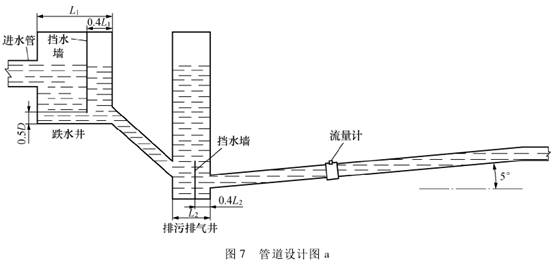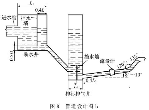 爲保證大(da)口徑流量(liang)計正常計(ji)量,其前後(hou)直管段、介(jie)質滿💃管、不(bu)能存氣等(děng)要求是需(xū)要滿足的(de)。但現場安(an)裝條件各(ge)不相♍同,針(zhen)對不同情(qing)況,從正确(que)計量的角(jiao)度出發,本(běn)文提出了(le)兩種管道(dào)📱鋪設及流(liu)量計安裝(zhuāng)的建議,分(fèn)别如圖7和(he)⛷️圖8所示。管(guǎn)道直徑爲(wèi)D,跌水井長(zhǎng)度爲L,配置(zhì)擋水牆,擋(dǎng)水牆底部(bù)距井底約(yue)0.5D,牆體距離(li)右壁約0.4L,;排(pai)污排氣井(jing)爲正方形(xing),尺寸爲1.5D×1.5D.即(jí)圖示L2=1.5D.内置(zhì)擋水牆,擋(dǎng)水牆頂㊙️與(yu).上遊㊙️管頂(ding)平齊,牆體(tǐ)距離右壁(bi)約🈲0.4L2。