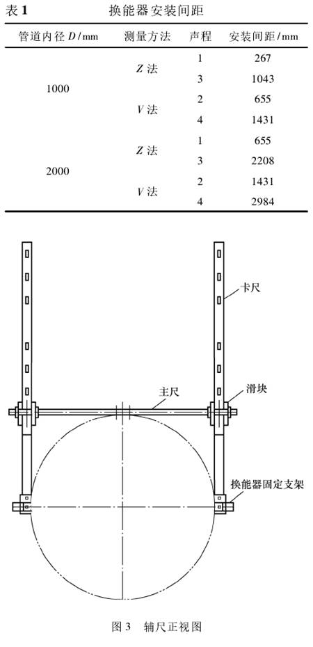 由于(yu)待測管徑(jing)巨大,管道(dao)截面爲非(fēi)标準圓形(xing)。以DN1800管道爲(wèi)☔例,不👨❤️👨同位(wei)置的外徑(jìng)最大可差(cha)35mm,極限情況(kuang)下,若傳感(gǎn)器安裝位(wèi)置的🧑🏽🤝🧑🏻直徑(jìng)🌏與平均直(zhi)徑的差值(zhi)恰好爲外(wài)徑🔆最大差(cha)即35mm,僅截面(miàn)面積一項(xiàng)帶來的誤(wu)差就🔅達3.8%。,傳(chuan)統的圍尺(chǐ)測量🔱直徑(jìng)的方✔️法獲(huò)得的是平(píng)均管💋徑,但(dan)無法指導(dao)檢測人員(yuán)将換能器(qi)安裝在平(píng)均管徑位(wei)置;即使在(zài)換能器之(zhī)間增加滑(hua)軌,也隻能(neng)🐇保證換能(néng)器安裝間(jian)距💞準确,不(bú)能保證換(huàn)能器連線(xian)的投影與(yǔ)軸線平行(hang)。因此🐪,本文(wen)設計了一(yī)套便于攜(xié)帶、易于現(xiàn)場組裝的(de)輔助設🙇♀️備(bèi)即輔尺,用(yong)于定位、安(ān)裝換能器(qi),基本結構(gou)如圖3、圖4所(suo)示。輔尺測(ce)量管徑範(fan)圍:800~2200mm,其主尺(chǐ)測.量不确(que)定度U=0.5mm(k=2)。能夠(gou)測量管道(dào)截面任意(yì)位置📐的外(wai)徑,保證換(huan)能器連線(xiàn)📞平行于管(guǎn)道軸心,較(jiao)好地解決(jue)換能器安(an)裝位置不(bu)精準帶來(lai)的問題,盡(jìn)可能地降(jiang)低測量過(guò)程中‼️的人(rén)爲影響,實(shí)用性強。
