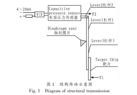 阻流件(靶片(piàn))接受的作用力F作(zuo)用在杠杆3(反饋杆(gǎn))上,杠杆3在F的作用(yong)下,以軸封膜片爲(wèi)支點(軸封膜片一(yi)方面💞作爲杠杆的(de)支🚩點,另一方面起(qǐ)密封作用)将力🤞F1傳(chuán)給副杆1,形成力F2副(fu)杆1的另一端與電(diàn)容力傳感器相連(lián),電容力傳感器把(bǎ)副杆1傳遞的力F2轉(zhuǎn)換成毫伏⭕電壓信(xin)号輸出: