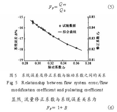 将上述(shu)結果整(zhěng)理後重(zhong)新畫在(zài)圖5中。圖(tú)中給出(chū).了系統(tǒng)誤差與(yǔ)脈動系(xi)數之間(jiān)的關系(xi),同時也(yě)給出了(le)所謂流(liu)量修正(zheng)系數與(yǔ)脈動系(xi)數之間(jiān)的關系(xi),流量修(xiū):正系數(shù)F,爲