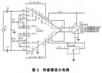 電路(lu)如圖3所示。IC2(SL28617)前(qián)置放大器用(yòng)于放大傳感(gan)器送來的反(fǎn)映流量大小(xiǎo)的電壓信号(hao),改.變圖中Rm和(hé)R。的阻值大小(xiǎo),可以改變該(gai)運🐪算放大器(qi)的增益。S1是勵(li)磁信号源,R17、R18是(shi)輸人偏置電(diàn)阻,運放的9腳(jiao)👣和16腳分❓别供(gong)+5V電壓,接🍉在運(yun)放IC2輸出端的(de)IC3(ADS8320)是16位高速的(de)🈲A/D轉換器,其轉(zhuǎn)換速度可達(dá)16kHz/s,接在前置放(fàng)大器與A/D轉換(huan)器之間📞的IC12(ISL21090)是(shi)三端穩㊙️壓器(qì)。