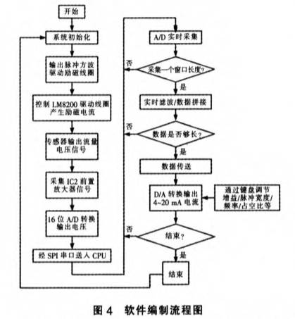 在編(bian)制礦用電磁(cí)流量計軟件(jiàn)的過程中,首(shǒu)先要求對系(xi)🏃🏻♂️統進行初始(shi)化、再對CPU進行(háng)初始化,由CPU輸(shu)出勵磁脈沖(chong)方波🏃♀️信号,控(kòng)制LM8200産生勵磁(cí)電流驅動勵(lì)磁線圈。采集(ji)傳🎯感器信号(hao),使傳感器送(sòng)♊出反映☁️.流量(liang)大小的電壓(ya)信号,經過IC2前(qián)置放大器放(fàng)❗大該信号,再(zài)經16位A/D轉換器(qi)和SPI串口送人(ren)單片機進行(hang)處理,在單片(piàn)機中要進行(hang)A/D實時采集🥵、實(shi)時濾波和數(shù)✊據拼接和數(shù)據傳送,最後(hòu)經過D/A轉換後(hòu)🤞,經過IC4轉換成(chéng)4~20mA電流✂️信号直(zhi)接輸出或者(zhě)以電壓形式(shì)輸出。