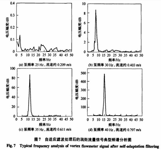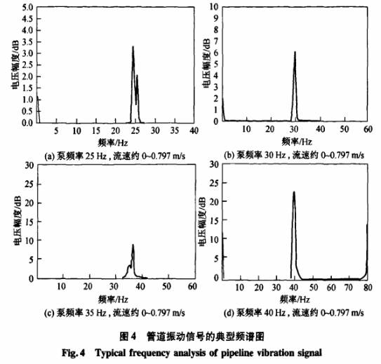 本研(yán)究對不同流速和(he)泵頻率組合下的(de)渦街流量🈚信号進(jìn)行了數據采集和(he)頻譜分析,其中水(shui)泵采用格蘭富AP12.40單(dān)❓級潛水泵🌏,分别調(diao)節流速約0.209,0.403,0.611,0.797m/s.控制水(shui)流速🤞的大小,在每(měi)一開度下,再分别(bie)設置水💁泵工作頻(pín)率爲25,30,35,40Hz,以輸人不同(tong)的振動幹擾信🔱号(hao),如圖2所示.可見當(dang)流速小時噪💯聲能(néng)量接近甚至大于(yu)實際信号能量,在(zai)線的頻譜💚分😄析很(hen)難判斷..