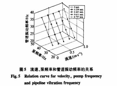 對(dui)表2的重複性數據(jù)計算平均值,并由(you)平均值畫出了流(liú)速、泵頻率和管道(dào)振動頻率的關系(xì)曲線,如圖5所示.分(fèn)析結果表明,不論(lùn)試驗裝置工況如(ru)何,管道振動信号(hào)的頻率和能量隻(zhī)與泵工作頻率相(xiang)關,泵頻率越大,則(zé)振動信号的頻率(lü)和能量越大.