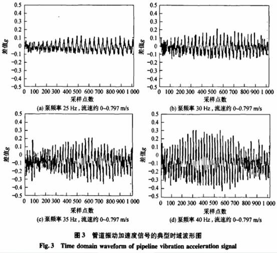 試驗工(gōng)作狀态:分别調節(jie)流速約爲0,0.209,0.403,0.611,0.797m/s,控制水(shuǐ)流速的大小,并在(zai)每--開度下,再分别(bie)設置水泵工作頻(pin)率爲25,30,35,40Hz.加速度傳感(gan)器的模🧑🏾🤝🧑🏼拟輸出信(xin)号輸人到PC機的A/D采(cǎi)集卡,采樣💛頻率1000Hz.對(duì)不同流速和泵頻(pín)率組合下的管道(dào)振動信号🔞進行數(shu)據采集和頻譜分(fèn)析.圖3爲所有組合(hé)下,采樣得到的管(guan)道振動加速度信(xìn)号的典型時✂️域波(bo)形圖.圖中橫坐标(biao)爲采樣的點數,共(gòng)1024點;縱坐标爲相對(dui)于Og标定值的差值(zhi),縱坐标基準值0對(duì)應了0g的标定值.圖(tú)4所示爲對應的管(guan)道振動信号的典(diǎn)型頻譜圖.