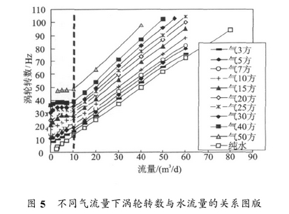 1)當水(shui)流量爲10m³/d以(yǐ)上,保持氣(qi)量不變,渦(wo)輪響應與(yǔ)水相流🌈量(liàng)呈🔞線性關(guān)系,而且随(suí)着氣量的(de)增加,渦輪(lun)響應與水(shuǐ)🐇流量🆚關系(xi)直線的斜(xie)率(即渦輪(lún)K值)明顯增(zeng)加。