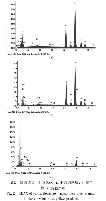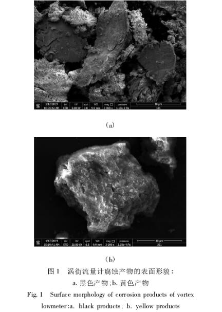 采用(yong)FEI公司QUANTAFEG450型場發射掃(sao)描電子顯微鏡(SEM)觀(guan)察數字式🐅渦街流(liú)量計表面剝離的(de)黑色和黃色腐蝕(shi)産物的表面☔形貌(mao),并用其自帶的能(néng)譜分析儀(EDAX)分析腐(fu)蝕産物的元素組(zǔ)成含量。測🈲試條件(jian):測試電💜壓20kV,光斑尺(chǐ)寸6.00μm,工作距離10mm;采用(yong)PHI5000VersaprobeII射線電子能譜儀(yí)(XPS)分析腐蝕産物的(de)存在形态,試驗使(shi)用Al靶。