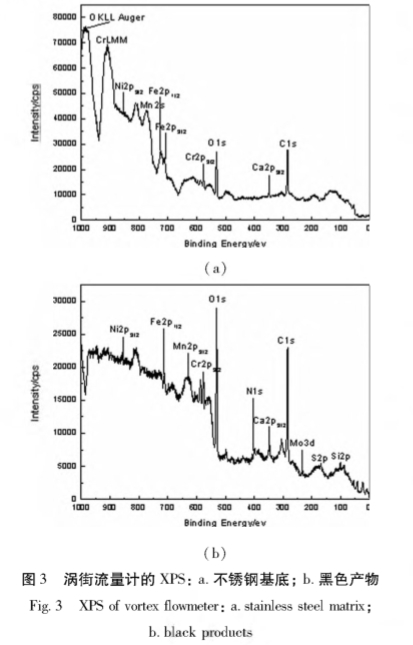 将渦街流(liú)量計的不鏽鋼基(ji)底和黑色腐蝕産(chǎn)物進行XPS分析,其測(ce)試結果如圖3所示(shì)。由圖3可見,不鏽鋼(gāng)基底含有C、Ca、O、Fe、Mn、Ni、Cr等元素(su)🚩;黑色腐蝕産物含(hán)有Si、S、C、Ca、N、O、Cr、Fe、Mn、Ni等元素。N元素的(de)分析與EDAX分析結果(guǒ)一緻;Si、大量Fe單📧質和(he)少🚩量Fe的氧化物形(xíng)式存在;黑色腐蝕(shí)産物中Fe主要以Fe2O3形(xing)式存在。不鏽鋼基(ji)底和黑✊色腐蝕産(chǎn)物Cr2p3/2的電子結合能(neng)分别爲574.4eV和㊙️576.7eV,與标準(zhǔn)圖譜Cr2p32中單質Cr的574.1eV和(hé)Cr2O3的576.6eV比較可知,不鏽(xiù)鋼基底💋中Cr元素主(zhǔ)要以單質Cr存在,黑(hēi)色腐蝕産物中Cr元(yuán)素以Cr203形式存在。同(tóng)理分析🔞,黑色腐蝕(shí)産物中🤞Ni元素以Ni2O3形(xíng)式存在。黑色腐蝕(shi)産物中NIs的電子結(jié)合能爲398.0eV,與NH.NO,的電子(zi)結合能398.5eV相對接近(jin),故黑色腐蝕産物(wu)中N元素最可能🏃♂️以(yi)NO,形式存在。