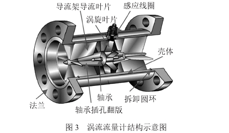 結(jié)構示意(yì)圖,該流(liú)量計屬(shǔ)于速度(du)式流量(liang)計,主要(yào)包括感(gǎn)應線圈(quan)、渦輪葉(ye)片、倒流(liu)架導流(liu)葉片、管(guan)道殼體(ti)等部件(jiàn)。