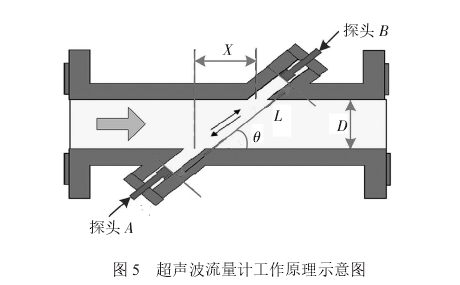 是通過(guo)檢測流(liu)體流動(dong)對超聲(shēng)脈沖的(de)作用來(lái)測量流(liu)量的一(yi)種非接(jie)觸式流(liú)量計。圖(tu)5所示爲(wei)采用時(shi)差法測(cè)量原理(li)的超聲(shēng)波流量(liang)計,當超(chāo)聲波在(zai)成品油(you)🌈長輸管(guan)道中傳(chuán)輸時,探(tan)🚩頭A與探(tàn)頭B分别(bié)🛀檢測接(jiē)收對方(fāng)發射的(de)超聲波(bo)脈沖,由(you)于順流(liu)方向聲(sheng)波傳播(bō)速度大(da)于逆流(liu)方向聲(shēng)波傳播(bo)速度,則(zé)相同傳(chuan)播距離(lí)🔞下就會(hui)得到不(bu)同的傳(chuan)播時間(jian)🚶♀️,利用傳(chuan)播時間(jian)之差👉即(jí)可計算(suàn)原油的(de)流速與(yu)👨❤️👨流量,計(jì)算公式(shì)如下: