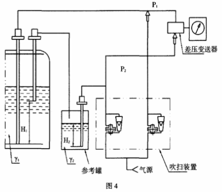 4.2在出(chu)口壓力變(biàn)化條件下(xià)的典型應(yīng)用-液位測(ce)量 如圖3所(suǒ)示,從A端通(tōng)人恒定流(liu)量的氣體(ti)時,氣體将(jiang)排出🚶♀️插入(rù)液💘體内管(guan)道内的介(jie)質并形成(chéng)穩定氣泡(pào),此時A,B間管(guǎn)内的壓力(lì)與👨❤️👨B端口液(yè)體壓力相(xiang)等。 如果B處(chù)的壓力爲(wèi)P,大氣壓力(lì)爲Po,則 P1-P0=△P 同時(shí): P1=yh+P0 則: P1-P0=γh=△P 因此,在(zai)已知介質(zhì)密度的條(tiáo)件下,利用(yòng) 差壓變送(sòng)器 或壓力(lì)計測量出(chū)OP,即可測量(liang)出液體液(yè)位h。 4.3在出口(kǒu)壓力變化(huà)條件下的(de)典型應用(yòng)-密度測量(liàng) 如圖4所示(shì),如果已知(zhi)被測介質(zhì)液位H1與參(cān)考介質液(ye)位H2已🚶♀️知🌈參(cān)考⚽介質密(mi)度γ2,利用差(cha)壓變送器(qì)測量的壓(ya)差,就可以(yi)測量出被(bèi)❓測介質密(mi)度γ1。