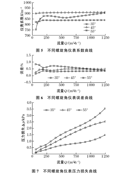 如(ru)圖5所示,采用(yong)螺旋升角爲(wèi)35°渦輪的流量(liàng)計的儀表系(xi)數曲線在工(gōng)作區内波動(dong)較大,對儀表(biao)計量的穩定(ding)性産生很大(da)的負面影響(xiǎng)。而45°和55°的渦輪(lún)流量計的儀(yí)表系數曲線(xian)在工作區内(nèi)波🔱動較小,線(xian)性度較理想(xiǎng),儀表在工作(zuo)區内的計量(liang)穩定性較好(hao)🍉。
