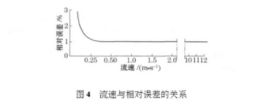由于現(xian)場灌漿(jiang)泵泵量(liàng)多爲6m³/h(100L/min),故(gu)EMF的量程(cheng)選爲100L/min,由(yóu)EMF的測量(liàng)原理可(kě)知⛷️[4],其流(liu)速的下(xià)限由.同(tong)噪聲或(huò)偏移的(de)信噪比(bi)S/N(信号與(yǔ)噪聲)來(lái)決定,上(shàng)限則由(you)測量管(guǎn)内襯裏(lǐ)👣的磨損(sun)和配管(guǎn)的經濟(ji)速度等(děng)來決定(dìng)印。由于(yú)水泥漿(jiāng)液中帶(dai)有水泥(ni)固✏️體顆(ke)粒,考慮(lü)到對EMF襯(chèn)裏和電(diàn)極的磨(mo)損,選用(yòng)流速≤5m/s,另(ling)一方面(miàn)水泥漿(jiang)液又具(jù)有易粘(zhan)附、沉澱(dian)、結垢🐉的(de)特性,故(gù)EMF測量管(guan)内的流(liú)速應不(bú)低于0.5m/s,以(yi)起到對(duì)電極和(hé)内襯的(de)自清掃(sǎo)作用。一(yi)般當測(ce)量管内(nèi)實際流(liu)速<0.1m/s時,感(gǎn)應電動(dong)勢已變(biàn)得十分(fen)微弱(零(ling)🔱點幾μV~幾(ji)μV),此時噪(zào)聲.的影(ying)響逐步(bu)變爲主(zhu)導,甚至(zhi)淹沒信(xìn)号電動(dòng)勢4],由流(liú)速與相(xiang)對誤差(cha)的關系(xi)🔅圖(圖4)可(kě)知,爲了(le)保證儀(yí)表的檢(jian)測精度(du),流速應(ying)大于0.5m/s.故(gù)推薦使(shǐ)⭐用流速(su)範圍爲(wèi)0.5~5m/s.