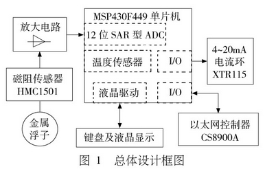 所以,對(duì)θ值的測(cè)量精度(du)直接關(guan)系到流(liú)量的測(cè)量精度(dù),本設計(jì)選用磁(cí)阻傳感(gan)器HMC1501測量(liàng)θ值,可保(bao)證模拟(nǐ)量測量(liang)🥵部分的(de)高精度(du)要求。前(qian)端模數(shu)轉換數(shù)據處理(li)和控制(zhi)部分,選(xuǎn)用内部(bu)集成高(gao)精度A/D轉(zhuǎn)換器和(hé)16位硬件(jiàn)乘法器(qì)的低功(gōng)耗單片(pian)機MSP430F449。接口(kǒu)設計分(fèn)🔆爲兩部(bù)分:(1)由電(dian)流變送(song)器XTR115提供(gong)标準🈲的(de)4~20mA電流環(huán)信👉号;(2)應(yīng)用CiruLogic公司(sī)✂️的10BASE-T以太(tai)網控🈲制(zhì)器CS8900A實現(xian)工業以(yǐ)太網接(jiē)口。總體(ti)設計框(kuang)圖如圖(tu)1所示。
