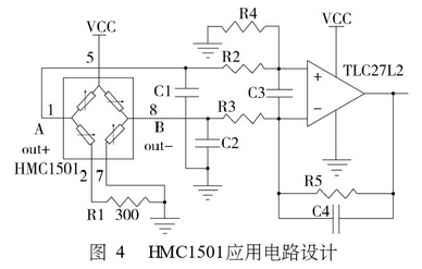 HMC1501輸(shu)出的橋(qiao)路信号(hao)較小,接(jie)入A/D之前(qian),需要進(jìn)行信号(hào)的👅放大(da)和調理(lǐ)。設計選(xuǎn)用典型(xíng)差分式(shì)放大電(dian)路,如圖(tú)4所示。