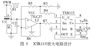 圖(tu)5是實現(xian)流量數(shu)據到電(diàn)流環的(de)DA轉換過(guo)程。MSP430單片(piàn)機❤️輸出(chu)PWM(脈寬調(diao)制)信号(hào),由RC積分(fèn)電路将(jiāng)脈沖信(xin)号轉換(huàn)⚽成連續(xu)的電壓(ya)信号。--級(jí)放大後(hou)送入XTR115電(dian)流變送(song)器,弱電(diàn)壓或電(dian)流信号(hào)經電流(liú)變送器(qi)XTR115放大📞,獲(huò)得4~20mA的标(biāo)準電流(liu)環輸出(chu)。流量或(huo)控制量(liàng)值💁與電(dian)流的對(dui)應關系(xi),由軟件(jian)标定程(cheng)序實現(xian)。