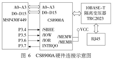 圖6所示(shì)的MSP430F449與CS8900A的(de)連接采(cǎi)用簡單(dān)的IO模式(shi)。該模式(shì)占用内(nei)🏃🏻存資源(yuán)少,相應(yīng)管腳MBMW和(he)MEMR需被置(zhi)高。單片(piàn)機通過(guò)/SBHE、/DW和/DR等控(kong)制信号(hao)線實現(xian)對CS8900A的工(gong)作方式(shi)控制和(he)讀寫操(cāo)作'6]。芯片(pian)使用中(zhōng)比較重(zhong)要的是(shi)🔞初始化(hua)🌈操作,包(bāo)括:軟件(jian)複位并(bing)檢查标(biāo)志位、設(she)定工作(zuo)模式、設(shè)定臨時(shi)以太網(wang)物理地(dì)址、設定(dìng)接收⛷️幀(zhēn)類型、确(què)定🚩數據(ju)傳送方(fang)向、中斷(duan)使能以(yǐ)及數據(ju)收發使(shǐ)能等。
