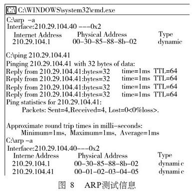 網絡測(cè)試環境(jing)如表2,網(wang)絡架構(gòu)如圖7。各(gè)設備上(shang)電初始(shǐ)化後,都(dōu)設定了(le)MAC地址和(he)IP地址,所(suǒ)有IP地址(zhǐ)均爲C類(lèi)地址。這(zhe)⛹🏻♀️樣即🌍可(kě)以接收(shou)以太網(wang)單播或(huò)廣播包(bāo)。首先,在(zai)主機.上(shàng)❗PC機測試(shi)終端流(liu)量計的(de)ARP工作機(jī)制和實(shi)現情況(kuàng)。結果如(ru)圖8所示(shi)。
