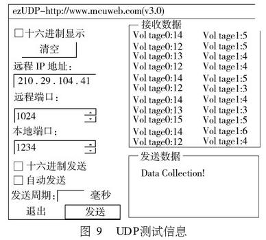 用ARP命令(ling)測試主(zhǔ)機ARP高速(sù)緩存中(zhōng)的IP和MAC地(di)址,此時(shi)隻有本(běn)地IP:210.29.104.1對💘應(ying)的MAC地址(zhǐ)00-30-85-88-8b-02;然後,用(yong)ping.程序測(ce)試網絡(luò)上的任(rèn)何㊙️一台(tái)流量計(jì)終端,圖(tú)中顯示(shì)對象IP:210.29.104.41的(de)測試結(jié)果,報文(wén)數據的(de)往返時(shi)🏃♂️間是lmS;最(zui)後,再次(ci)🐕測試主(zhu)💛機的ARP高(gāo)速緩存(cun),結果顯(xian)示已添(tian)加了對(dui)象終端(duān)的IP和MAC地(di)址。測試(shì)主機和(he)終端流(liú)🐉量計之(zhi)間UDP數據(jù)的傳輸(shū)效果。UDP協(xié)議提供(gòng)簡單的(de)面向數(shu)✨據報的(de)傳輸層(ceng)協議。一(yi)個簡單(dan)的UDP應用(yong)程序如(rú)圖9所示(shì)。主機對(duì)終端流(liu)量計發(fā)送UDP數據(jù)命令,當(dang)流量計(jì)收到"DataCollection!”命(ming)♋令就回(huí)送采集(ji)到的兩(liang)路ADC的電(diàn)壓信号(hao)值。測試(shi)結果表(biao)明接收(shōu)和發送(song)數據包(bao)⭕正确♻️率(lǜ)高,丢包(bao)極少,實(shí)現了UDP數(shu)🏃♂️據處理(li)功能。