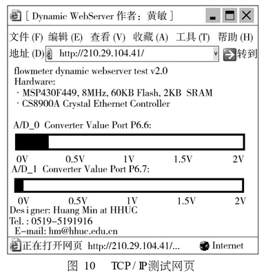 通(tōng)過TCP簡化(hua)協議實(shi)現了基(ji)于HTTP協議(yi)的終端(duan)流量計(ji)WEB服務,簡(jiǎn)化的HTML網(wǎng)頁數據(jù)保存在(zai)MCU的片内(nei)FLASH存儲器(qi)中。HTTP服務(wu)器可以(yi)動态實(shí)時更新(xīn)數據。在(zài)浏覽器(qi)的URL地址(zhi)中鍵入(ru):htp://210.29.104.41,就可以(yǐ)浏覽如(rú)圖10所示(shì)的頁面(mian),網頁動(dong)态顯示(shì)出采集(ji)到的流(liu)量值。