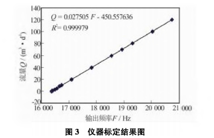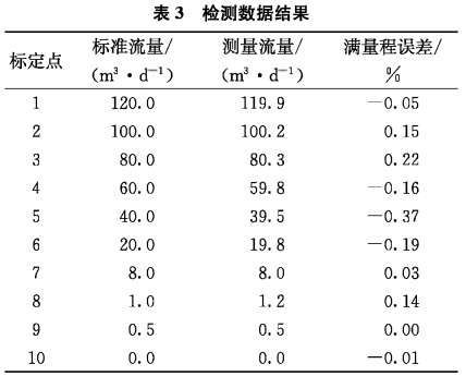 将儀(yi)器連接封隔裝置(zhì)放人标定井簡中(zhōng),封隔裝置密封儀(yi)器外璧與井簡内(nei)壁形成的環形空(kong)間,保證🛀流體完全(quán)♈進人測量通道🈲。給(gei)儀器供電進行流(liú)量調節,流量調節(jiē)爲0.5.1.0.3.0、5.0、8.0、10.0、20.0、40.0、60.0、70.0、80.0、100.0、120.0m3/d,記錄每一流量(liang)點時的儀器輸出(chū)頻🈲率,記錄時💔間爲(wèi)2min。計算每一流量點(dian)時的儀器輸出頻(pin)率平均值,将數據(ju)進行線性拟合,得(de)到儀器的标定檢(jian)測結果圖見圖3,儀(yi)器的檢測數據結(jie)果(見表3)。由圖🥵3可見(jiàn),随着流量的增大(da),儀器輸出頻率線(xiàn)性增加,線性相關(guan)系數爲0.9999979,顯示出儀(yi)器具有良好的線(xian)性響應。由表3可見(jiàn),在0.5~120.0m³/d流量範圍内,儀(yí)器✨測量誤差在±1%之(zhi)内。